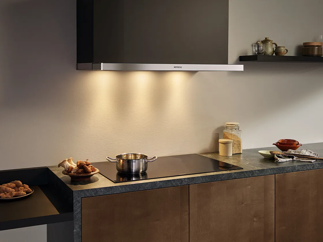 With the distinctive Siemens design using glass and chrome lines, our ventilation systems create a design statement that seamlessly harmonizes with other Siemens appliances. Whether hung over an island, integrated into a cooktop or hidden in the counter, our range of ventilation systems gives you creative freedom. All Siemens cooker hoods provide a powerful performance.